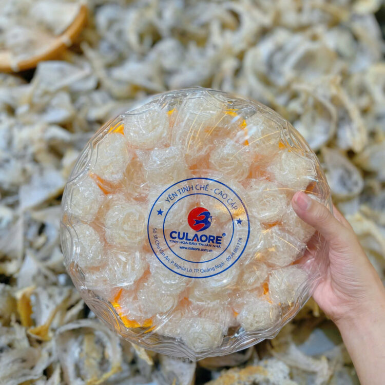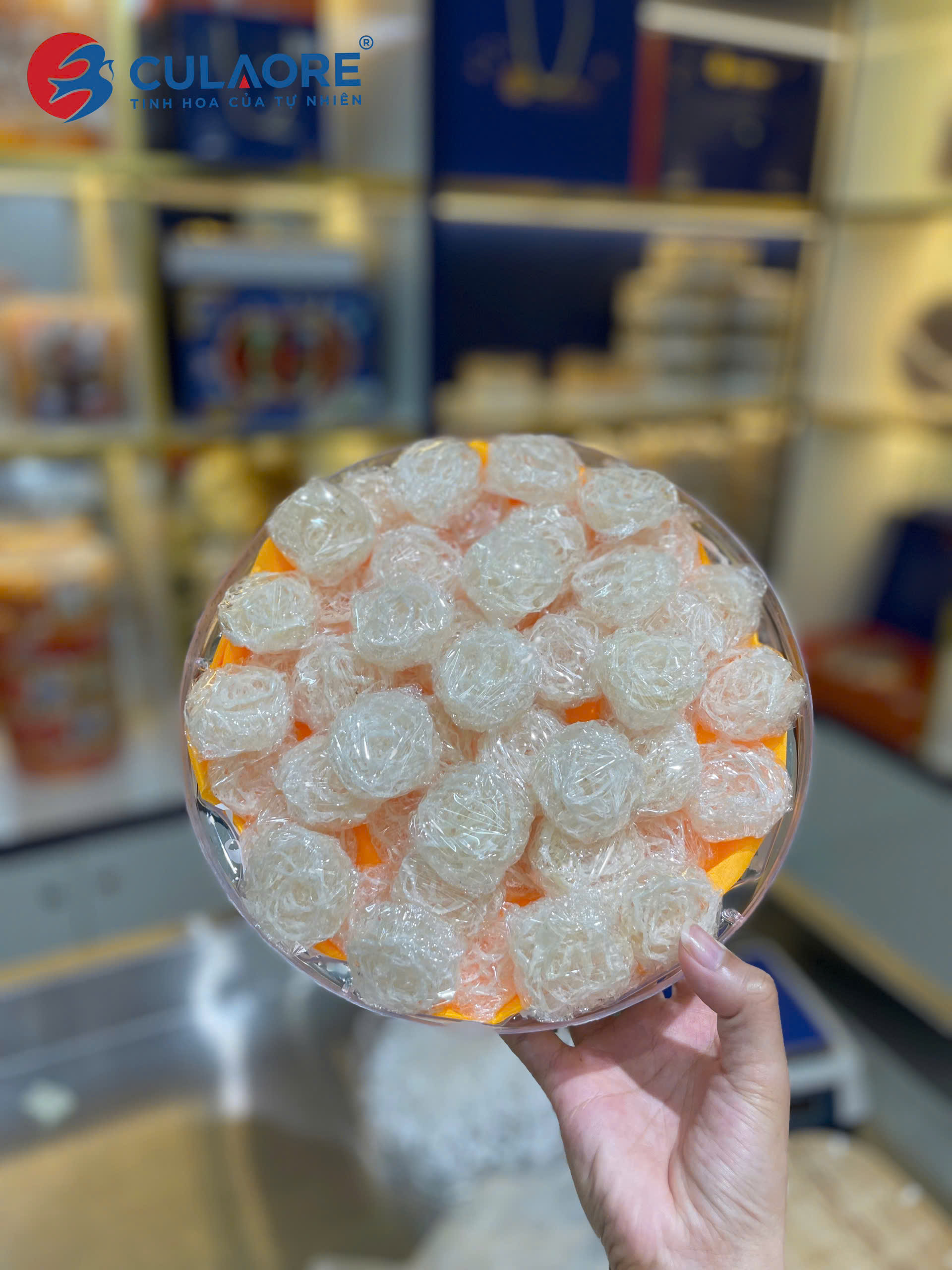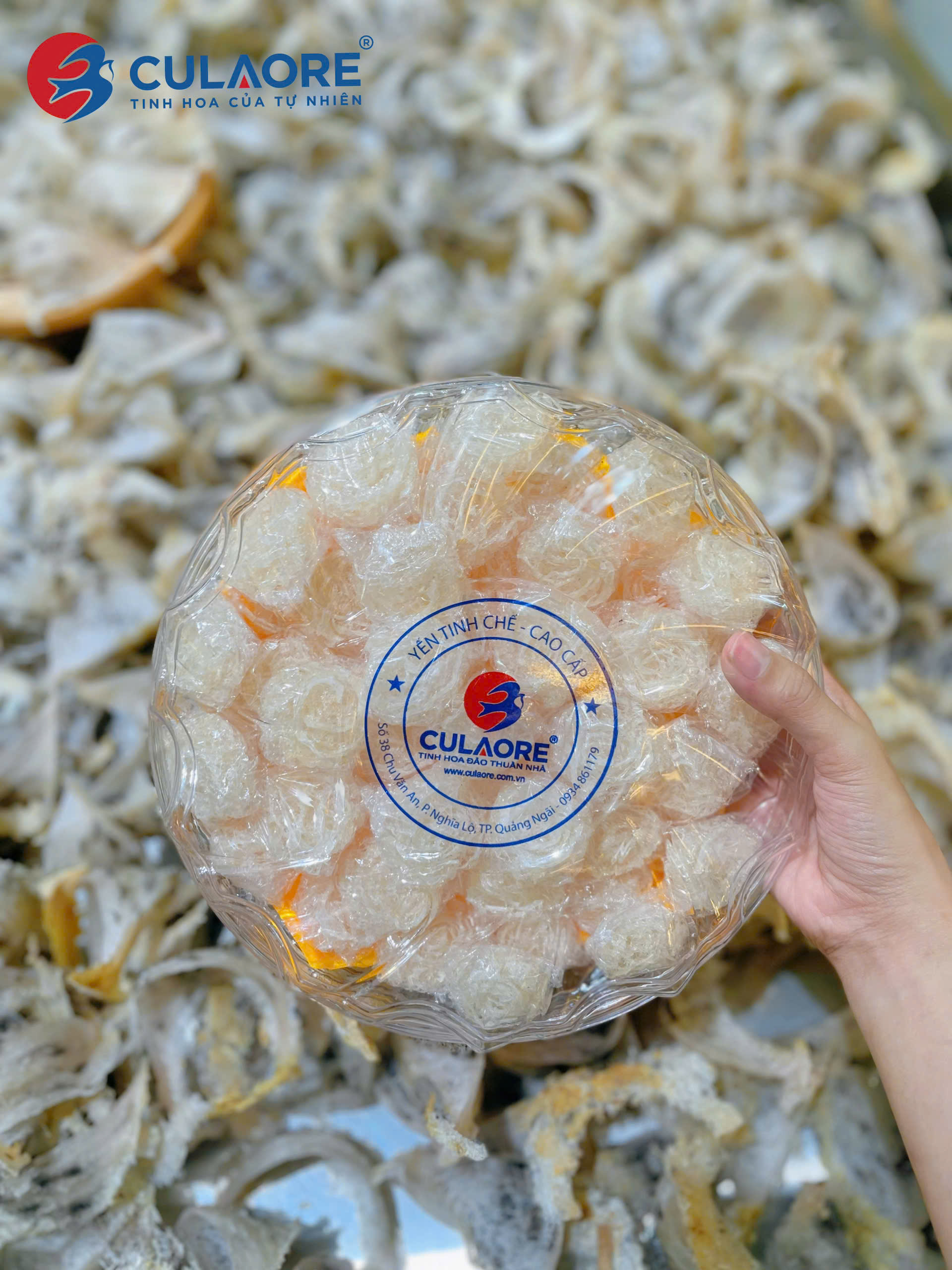 Yến tinh chế viên hoa hồng CULAORE là dòng yến sơ chế có hình dạng viên hoa hồng, trọng lượng giữa các viên gần bằng nhau. Sản phẩm vẫn giữ nguyên được mùi đặc trưng của yến, có sợi phồng, màu trắng ngà, tỷ lệ sợi dài chiếm 50% còn lại là sợi ngắn và vụn yến.